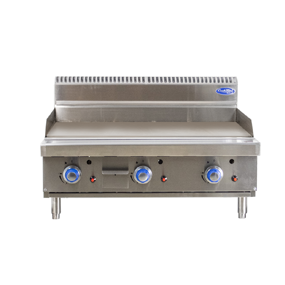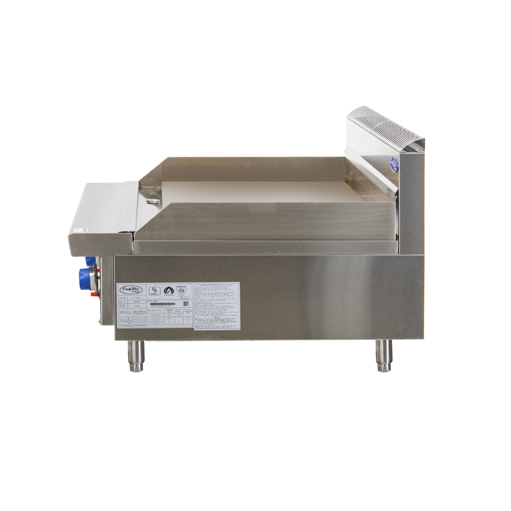 The griddle plate of the CookRite is heavy-duty and 12mm thick, ensuring durability and even heat distribution for uniform cooking results. Its polished surface enhances food presentation and facilitates easy cleaning after use. Constructed with a robust stainless-steel exterior and interior, this flat-top griddle is built to withstand the rigors of daily kitchen operations while ensuring long-lasting performance.